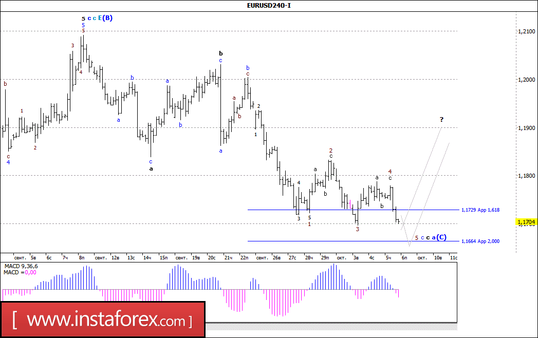 The publication of the minutes of the last meeting of the ECB, which noted that the change in the parameters of monetary policy should be gradual and cautious, exerted considerable pressure on the euro, allowing the EUR / USD pair to resume the downward movement in the middle of yesterday's trading and to test the level of the 17th figure at the end of the day. It can be assumed that after completing the 4th wave, c, c, a, (C) in a somewhat truncated form, the currency pair moved to the stage of formation of the 5th wave, c, c, a, (C). If this is so, then the internal wave dimensionality of the wave c, a, (C) allows the currency pair to continue the decline of quotations at least to the level of 1.1665 - 1.1650.