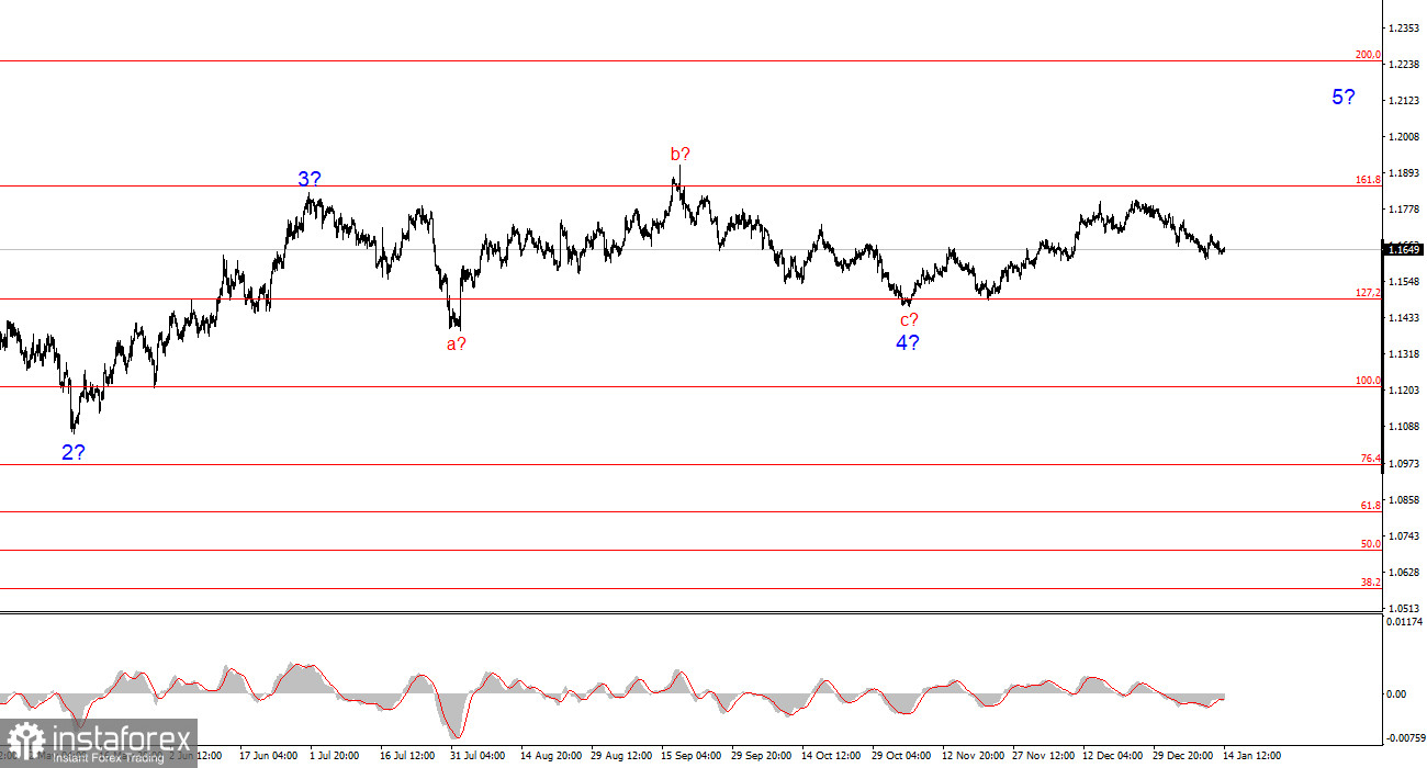 The wave count on the 4-hour chart for EUR/USD remains unchanged. There is no talk of canceling the upward section of the trend that began in January of last year, but the wave structure since July 1, 2025, has taken on an extended, corrective appearance. In my view, the pair has completed the construction of corrective wave 4, which has an unusual internal structure. Within this wave, we have observed exclusively corrective structures, so there is no doubt about the corrective nature of this wave.