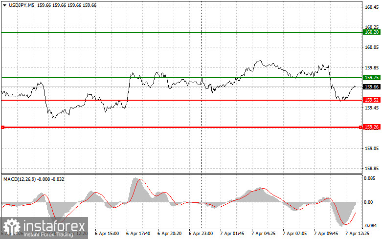 Scenario No. 2: I also plan to sell USD/JPY if there are two consecutive tests of the 159.75 level while the MACD indicator is in the overbought zone. This will limit the pair's upward potential and lead to a downward reversal. A decline toward the opposite levels of 159.52 and 159.26 can be expected.