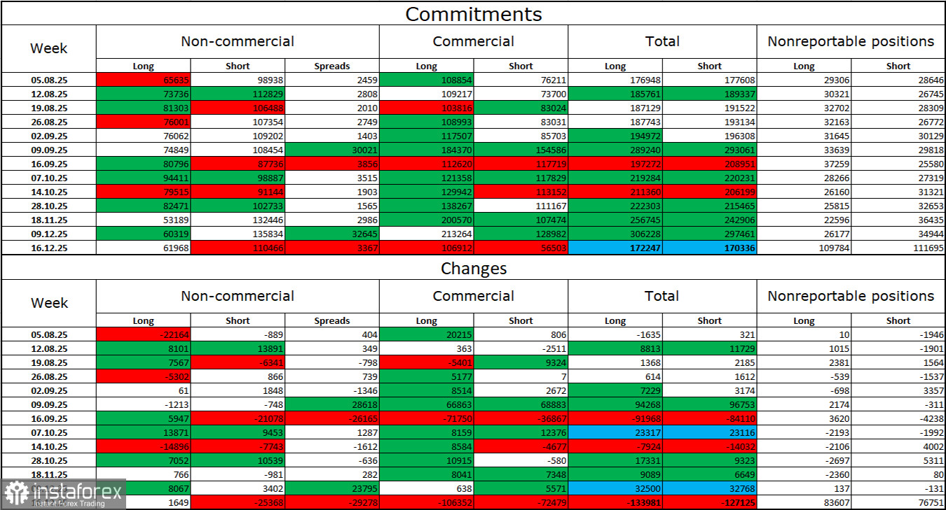 The sentiment of the "Non-commercial" trader category became more "bullish" over the last reporting week. The number of long positions held by speculators increased by 1,649, while the number of short positions decreased by 25,368. The gap between the number of long and short positions is now effectively as follows: 61 thousand versus 110 thousand. As we can see, bears dominated in December, but the British pound seems to have already exhausted its downward potential. At the same time, the situation with contracts on the euro currency is the opposite. I still do not believe in a "bearish" trend for the pound.
