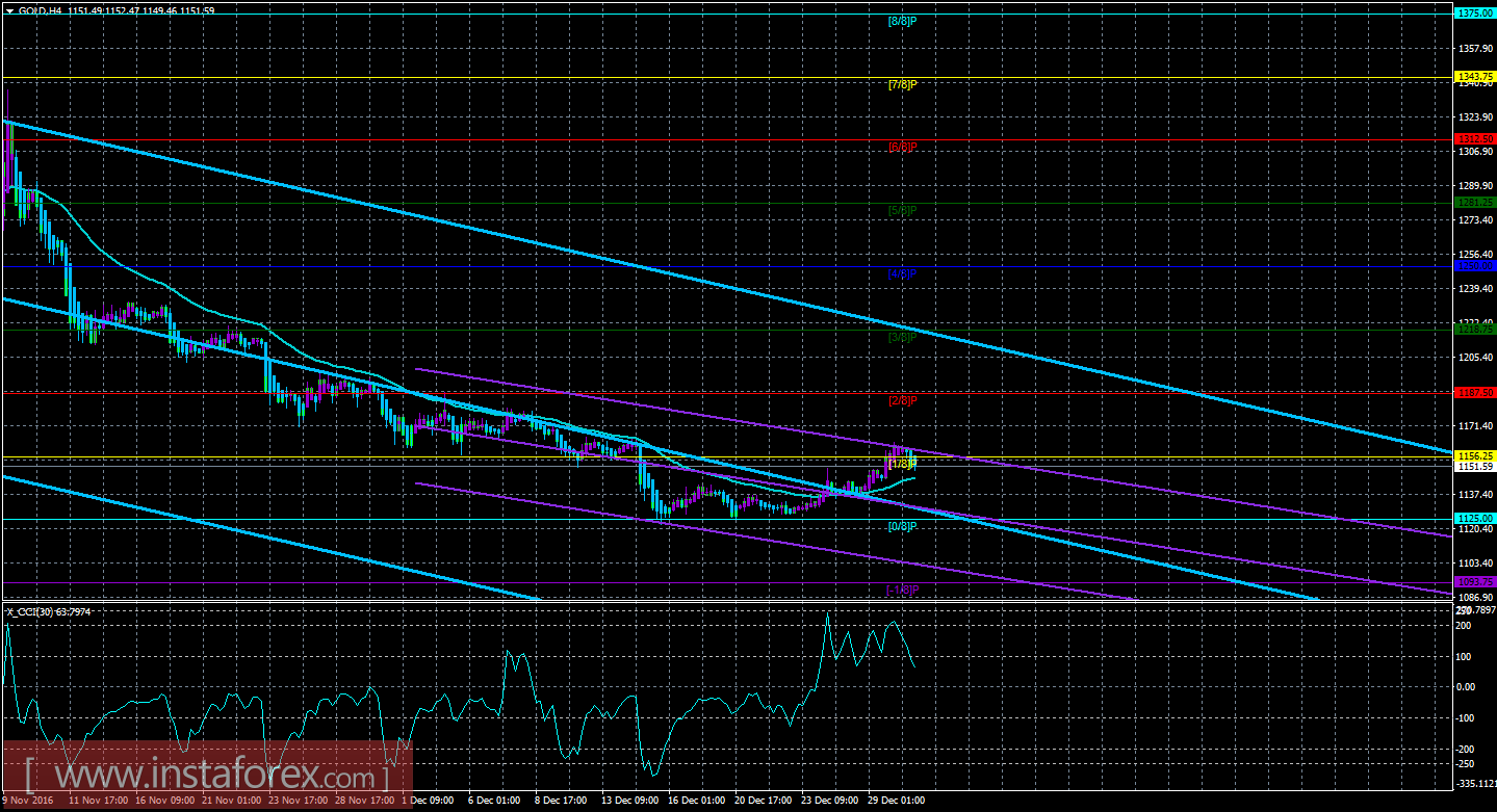 Из технической картины, сложившейся по золоту 2 января, видно, что цена начала слабую коррекцию с целью скользящая средняя. Старший канал направлен вниз, что свидетельствует о нисходящем направлении движения глобального тренда. Младший канал также направлен вниз, что означает нисходящее направление движения и в среднесрочном плане. Сейчас цена находится выше мувинга и выше уровня Мюррея «0/8», что указывает на восходящее направление движения в ближайшие дни. Первой целью для движения вверх, таким образом, остается уровень Мюррея «2/8» - 1187,50, но лонги сейчас по-прежнему не рекомендуется рассматривать. Если этот таргет будет преодолен, то новой целью будет являться уровень Мюррея «3/8» - 1218,75. Мувинг направлен вверх, а цена находится выше него, поэтому сейчас более вероятно восходящее движение. Хайкен Аши окрасил последние бары в голубой цвет, что сигнализирует о локальном нисходящем движении, однако длинные позиции сейчас не актуальны в любом случае. Ордера на покупку можно будет рассматривать только после разворота вверх хотя бы одного канала. Короткие позиции станут актуальными только ниже мувинга. Индикатор CCI находится около уровня 100, что сигнализирует о слабой перекупленности инструмента.