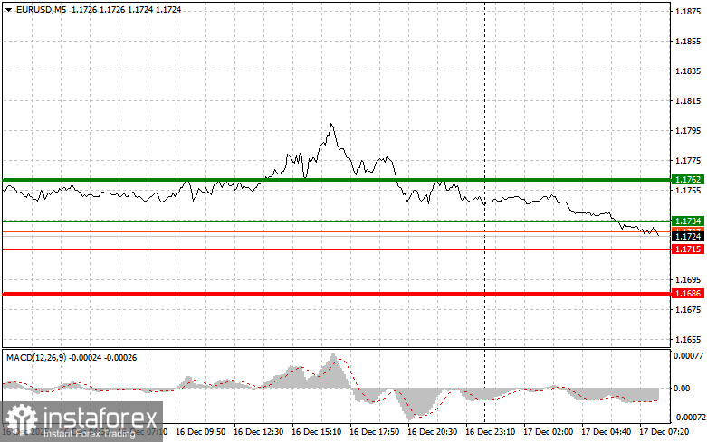 Сценарий №2: покупать евро сегодня также собираюсь в случае двух подряд тестов цены 1.1715 в момент, когда индикатор MACD будет находиться в области перепроданности. Это ограничит нисходящий потенциал пары и приведет к обратному развороту рынка вверх. Можно ожидать рост к противоположным уровням 1.1734 и 1.1762.