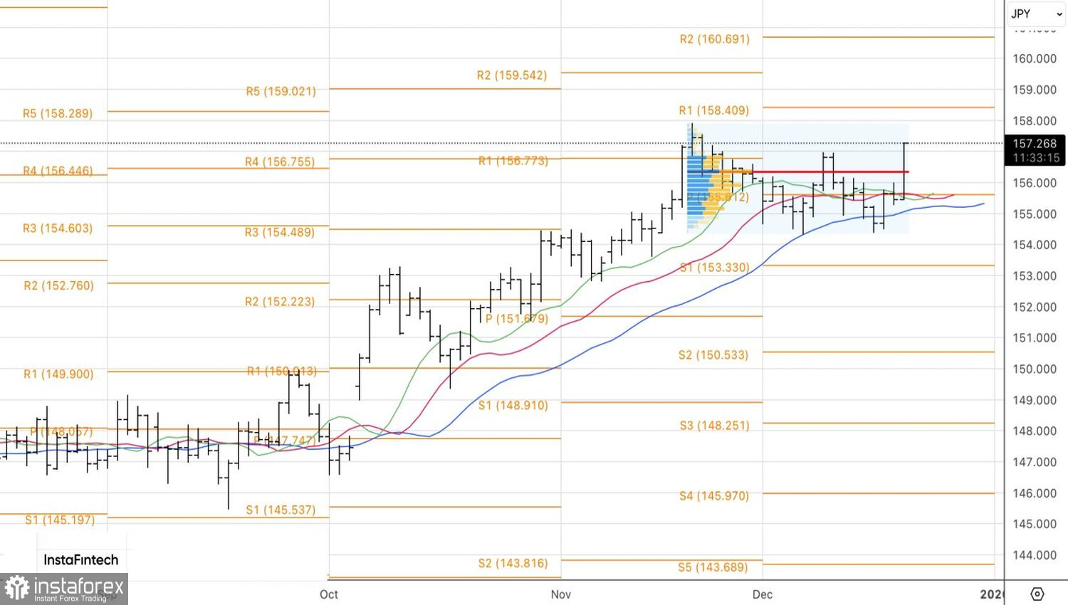 Технически на дневном графике USD/JPY имеет место попытка «быков» восстановить восходящий тренд. Они сумели вывести пару за пределы верхней границы диапазона справедливой стоимости 154,90-156,85. Теперь этот уровень выступает в качестве ключевой поддержки. Открытые от него лонги следует удерживать и периодически наращивать.