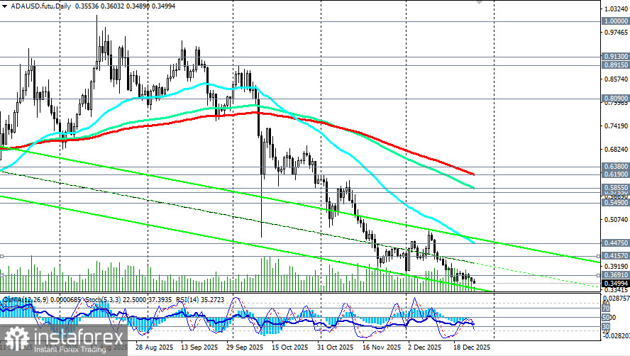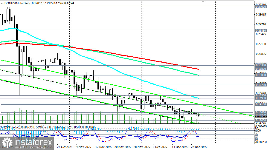 Сегодня, в условиях праздничного рождественского периода, минимальной активности трейдеров и на момент публикации данной статьи, пара DOG/USD торговалась вблизи отметки 0.1263, немного поднявшись с внутридневного минимума 0.1257, а пара ADA/USD – вблизи отметки 0.3500, на 10 пунктов выше внутридневного минимума 0.3490. Обе криптовалютные пары двигаются в зоне долгосрочного медвежьего рынка в сторону их минимальных значений с момента выпуска этих криптовалют и появления на рынке.