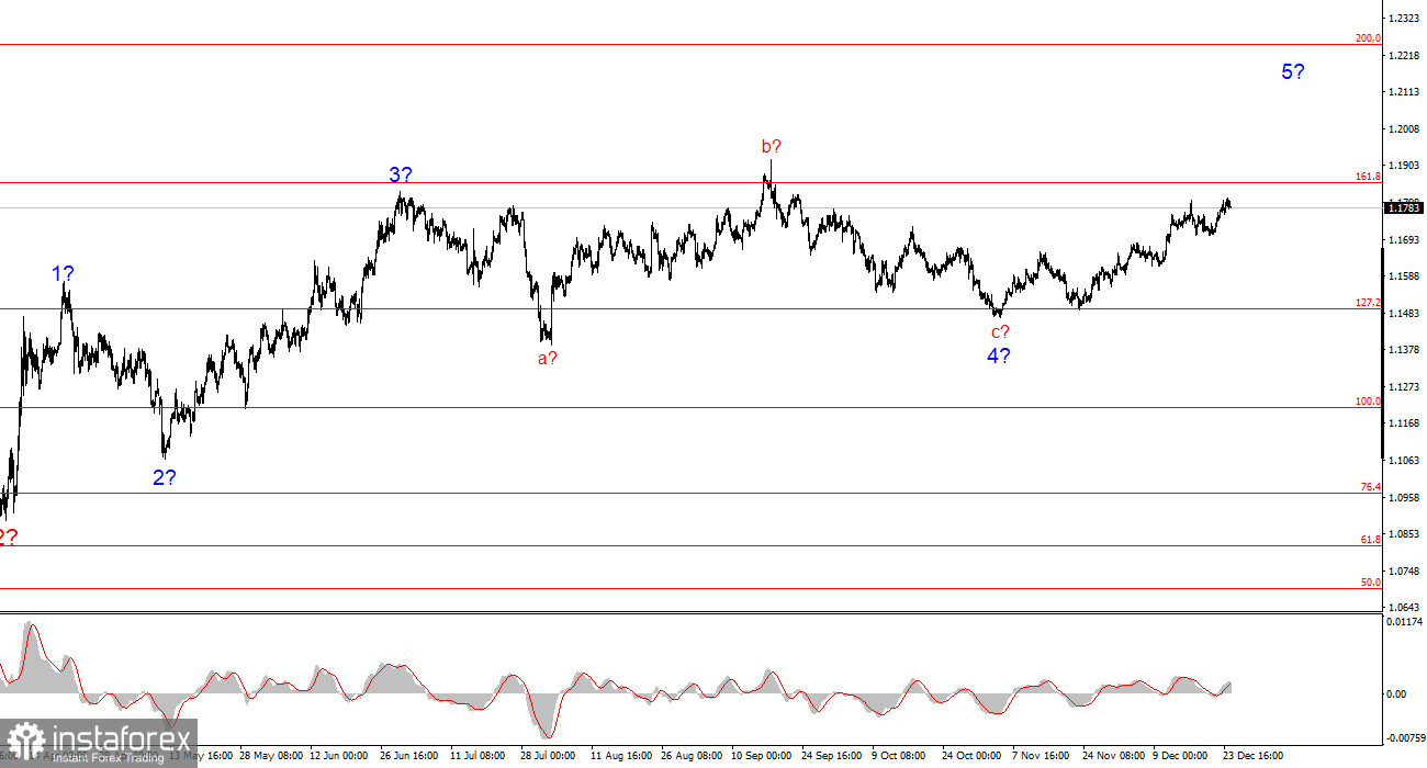 Волновая разметка 4-часового графика для инструмента EUR/USD имеет вполне понятный, хоть и довольно сложный вид. Об отмене повышательного участка тренда, который берет свое начало в январе 2025 года, речи не идет, но волновая структура, начиная с 1 июля, приняла сложный и протяженный вид. На мой взгляд, инструмент завершил построение коррекционной волны 4, которая приняла очень нестандартный вид. Внутри этой волны мы наблюдали исключительно коррекционные структуры, поэтому сомнений в коррекционном характере снижения не возникает никаких.