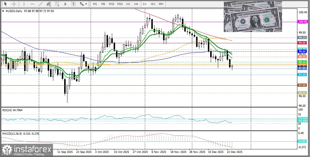 Индекс доллара (DXY), отслеживающий курс доллара по отношению к корзине валют на фоне ожиданий еще двух снижений процентных ставок ФРС в 2026 году снизился до минимумов, наблюдавшихся в октябре.