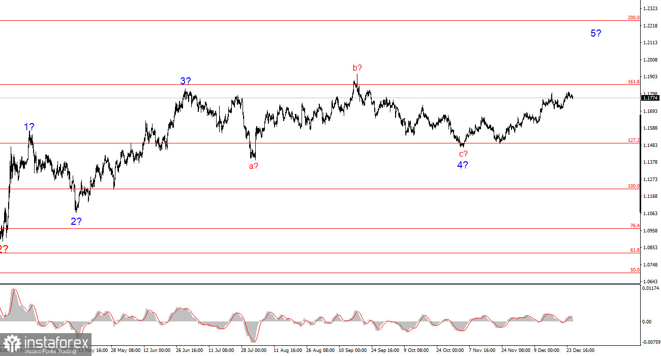 Исходя из проведенного анализа EUR/USD, я делаю вывод, что инструмент продолжает построение повышательного участка тренда. Политика Дональда Трампа и денежно-кредитная политика ФРС остаются весомыми факторами падения американской валюты в долгосрочном плане. Цели текущего участка тренда могут простираться вплоть до 25-й фигуры. Текущий восходящий набор волн начинает получать развитие, и хочется верить, что сейчас мы наблюдаем построение импульсного набора волн, входящего в состав глобальной волны 5. В этом случае следует ожидать роста с целями, находящимися около отметок 1,1825 и 1,1926, что соответствует 200,0% и 261,8% по Фибоначчи.