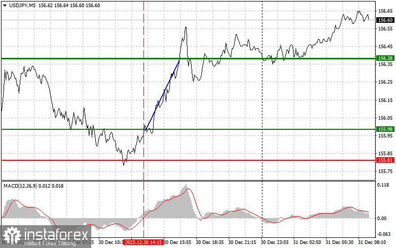 Сценарий №2: продавать USD/JPY сегодня также планирую в случае двух подряд тестов цены 156.66 в момент, когда индикатор MACD будет находиться в области перекупленности. Это ограничит восходящий потенциал пары и приведет к обратному развороту рынка вниз. Можно ожидать снижения к противоположному уровню 156.50 и 156.25.