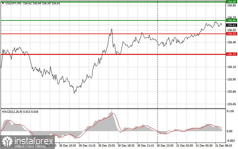 Сценарий №2: покупать USD/JPY сегодня также планирую в случае двух подряд тестов цены 156.50 в момент, когда индикатор MACD будет находиться в области перепроданности. Это ограничит нисходящий потенциал пары и приведет к обратному развороту рынка вверх. Можно ожидать рост к противоположным уровням 156.66 и 156.89.