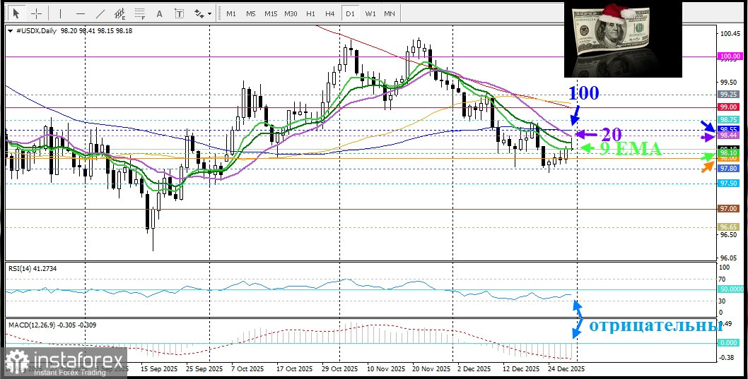 Индекс доллара США (DXY) в среду торгуется немного выше, оставаясь в узком диапазоне на фоне спокойной последней сессии уходящего года. После краткосрочного подъема к области 20-дневной скользящей средней, зафиксированного перед началом американской сессии, индекс утратил значительную часть внутридневной прибыли. В настоящее время DXY, отражающий динамику доллара по отношению к корзине из шести основных валют, удерживается вблизи 9-дневной ЕМА. Годовое снижение индекса приближается к 10%, делая 2025 год худшим для доллара за последние восемь лет.