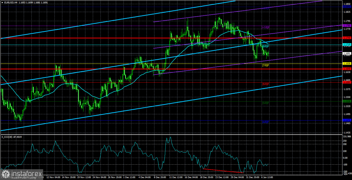 Средняя волатильность валютной пары EUR/USD за последние 5 торговых дней по состоянию на 7 января составляет 50 пунктов и характеризуется, как «средне-низкая». Мы ожидаем движение пары между уровнями 1,1640 и 1,1740 в четверг. Старший канал линейной регрессии направлен вверх, но по факту все еще продолжается флэт на дневном ТФ. Индикатор CCI заходил в начале декабря в область перекупленности, но небольшой откат мы уже увидели. На прошлой неделе была сформирована «бычья» дивергенция, которая указывает на возобновление восходящего тренда.