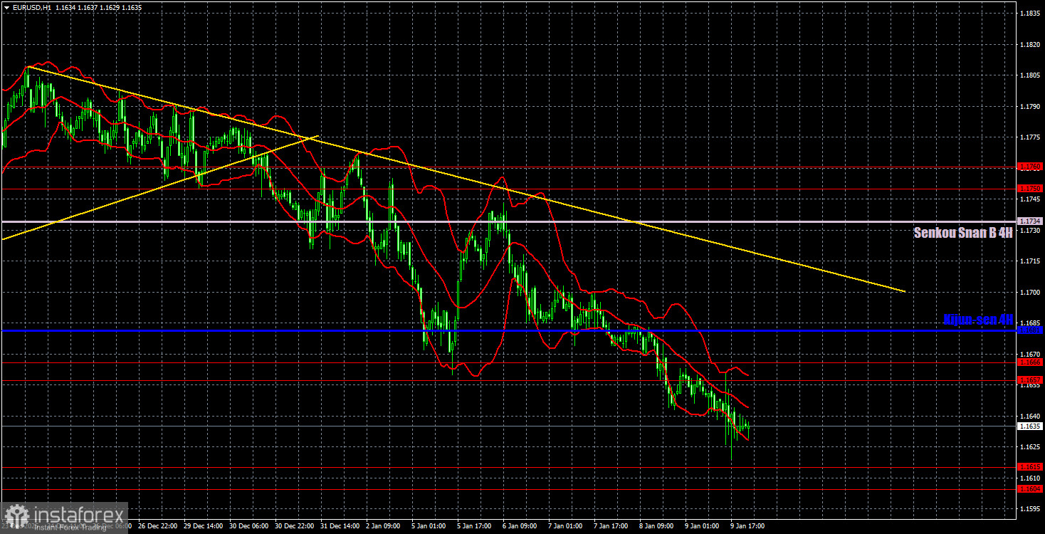 Валютная пара EUR/USD продолжает вяло скатываться вниз. И пятница абсолютно ничего не изменила, несмотря на сильный макроэкономический фон. В последний торговый день прошлой недели были опубликованы, как минимум, отчеты по рынку труда и безработице в США, но даже их не хватило для волатильность выше обычного. А «обычное» сейчас невелико. Пара EUR/USD продолжила снижение, что вписывается в текущую техническую картину и на часовом, и на дневном ТФ. На часовом графике у нас имеется нисходящая тенденция с линией тренда, а на дневном – флэт и отработка его верхней границы. Поэтому доллар США, не имея веских причин, может продолжать рост на технических факторах. В целом, американская валюта растет уже три недели. Падение пары началось 24 декабря. За это время доллар вырос на 180 пунктов. Это не много, но и не мало. Движение вниз не сильное, но ежедневное.