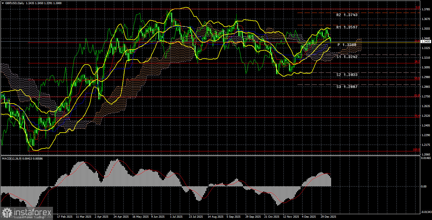 Валютная пара GBP/USD на прошлой неделе потеряла всего лишь 50 пунктов и чувствовала себя увереннее пары EUR/USD. Понедельник спас британский фунт от более сильного падения. Напомним, что в понедельник рынок как раз отрабатывал вторжение Трампа в Венесуэлу и захват президента этой страны, а также очередной «прекрасный» отчет из США – индекс деловой активности в секторе производства. Именно в этот день «безопасный» доллар США потерял около 100 пунктов, а волатильность была наивысшей. Таким образом, мы по-прежнему считаем, что геополитика не будет способствовать укреплению американской валюты.