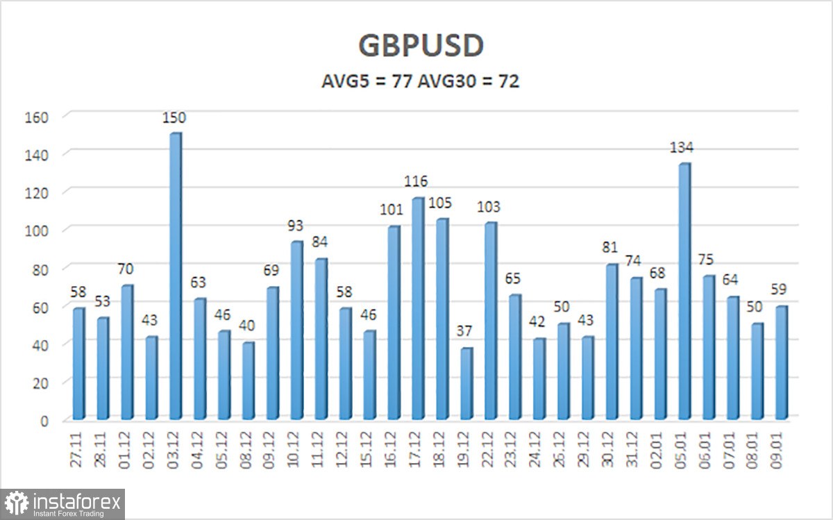 Средняя волатильность пары GBP/USD за последние 5 торговых дней составляет 77 пунктов. Для пары фунт/доллар это значение является «средним». В понедельник, 12 января, таким образом, мы ожидаем движения внутри диапазона, ограниченного уровнями 1,3323 и 1,3477. Старший канал линейной регрессии развернулся вверх, что указывает на восстановление тренда. Индикатор CCI шесть раз заходил в область перепроданности за последние месяцы и сформировал множество «бычьих» дивергенций, что постоянно предупреждает трейдеров о продолжении восходящего тренда.
