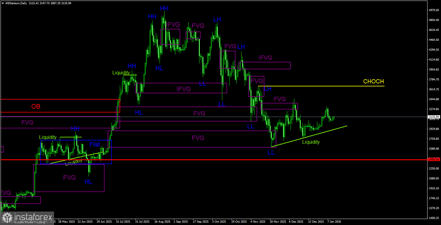 Биткоин сломал восходящую структуру на дневном ТФ и впервые за 3 года занялся формированием полноценного нисходящего тренда. Две ближайшие цели(«бычий» OB в области 98 000$ – 102 700$ и «бычий» FVG) отработаны, теперь стоит ожидать падения к уровню 70 800$(уровень 50,0% по Фибоначчи от трехлетнего восходящего тренда). Из областей POI на продажу можно выделить только «медвежий» FVG на дневном ТФ, расположенный в области 96 800$ – 98 000$, до которого биткоин пока не может добраться. На 4-часовом ТФ сигнал на продажу был сформирован, отработана цель 89 200$. В ближайшее время может быть сформирован новый сигнал на продажу, аналогичный предыдущему. Или флэт завершится.