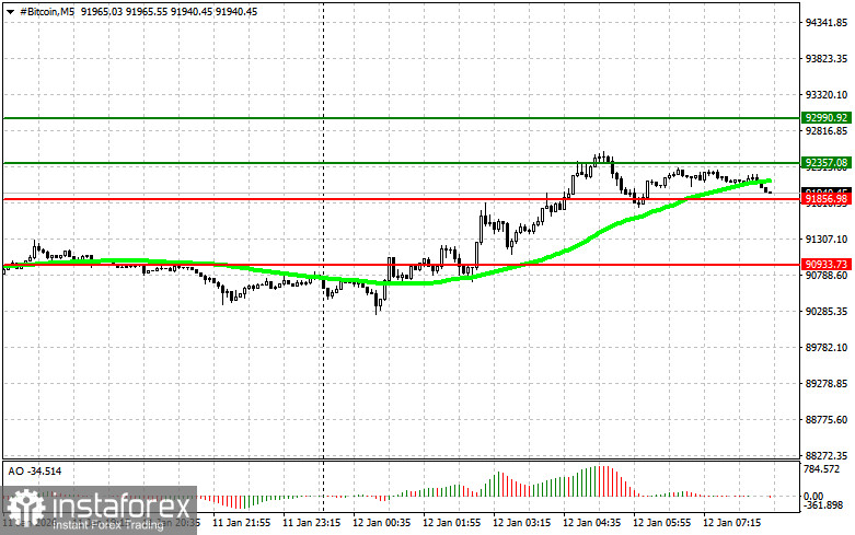 Сценарий №2: покупать биткоин можно от нижней границы $91 800 при отсутствии рыночной реакции на ее пробой в обратную сторону к уровням $92 300 и $92 900.