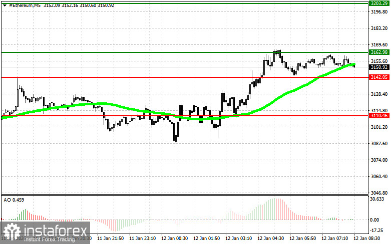 Сценарий №2: покупать эфир можно от нижней границы $3142 при отсутствии рыночной реакции на ее пробой в обратную сторону к уровням $3162 и $3203.