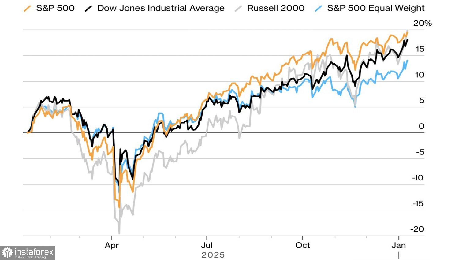 Доказательством являются последние сильные данные по Соединенным Штатам. Занятость выросла на 50 тыс. в декабре, как и прогнозировали эксперты Bloomberg, безработица упала до 4,4%. Инвесторы воспринимают охлаждение рынка труда с пониманием. Массовые депортации, сокращение государственного аппарата и снижение чистой миграции привели к уменьшению рабочей силы. Экономика и не должна добавлять более 50 тыс, чтобы в таких условиях выглядеть здоровой.