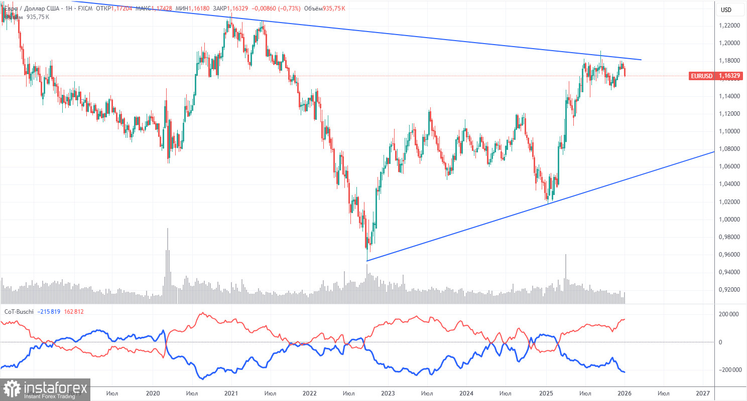 Последний отчет COT датирован 6 января. На иллюстрации выше отлично видно, что нетто-позиция некоммерческих трейдеров долгое время была «бычьей», медведи с трудом перешли в зону собственного превосходства в конце 2024 года, но очень быстро ее потеряли. С тех пор, как Трамп вступил в должность президента США во второй раз, падает только доллар. Мы не можем сказать, что падение американской валюты продолжится с вероятностью 100%, но текущее развитие событий в мире намекает именно на этот вариант. Красная и синяя линия удаляются друг от друга, что свидетельствует о сильнейшем превосходстве быков.