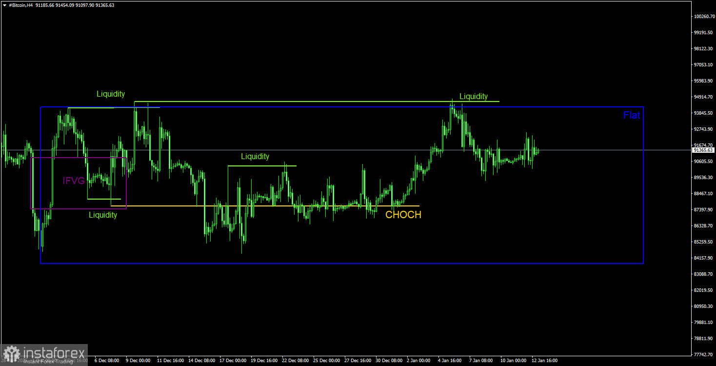 Таким образом, в текущей ситуации остается только два варианта развития событий. Либо ждать завершения флэта, либо торговать от его границ. Ждать завершения флэта можно долго, поэтому лучше искать возможности для открытия позиций у границ флэта. Нисходящий тренд на дневном ТФ сохраняется, поэтому мы в любом случае ждем возобновления падения «цифрового золота». С нашей точки зрения, перспективы биткоина на 2026 год весьма туманные. Многие эксперты отмечают слабый спрос на криптовалюты после 10-11 октября 2025 года, когда произошел тотальный крах рынка. Также многие отмечают снижающийся спрос среди институциональных инвесторов и отмену паттерна «рост биткоина на халвинге». Проще говоря, те закономерности, которые раньше позволяли биткоину расти, сейчас уже не работают.