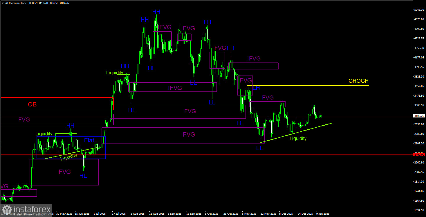 На дневном ТФ продолжается формирование нисходящей тенденции. Ключевым паттерном на продажу выступал и выступает «медвежий» Order-block на недельном ТФ. Движение, спровоцированное этим сигналом, может быть еще не завершено. А вот коррекция на криптовалютном рынке может быть завершена в ближайшее время. На дневном ТФ по эфиру нет понятных областей POI на продажу. На 4-часовом ТФ их также нет, поэтому ориентироваться в ближайшее время следует по биткоину. Однако отметим пул ликвидности на дневном графике в виде линии тренда. Ниже этой линии располагаются Stop Loss и отложенные ордера на продажу. А эти ордера – это ликвидность. Мы практически уверены, что эфир покажет падение ниже линии тренда. Ближайшие цели – 2 717$, 2 618$ и 2 400$ – остаются актуальными. И это лишь ближайшие цели. Потенциал падения эфира – гораздо выше.