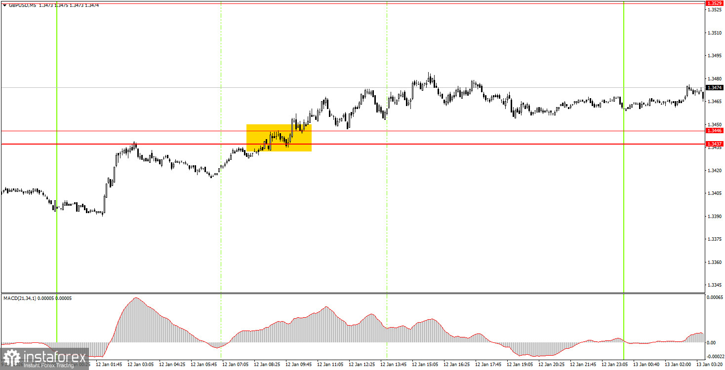 На 5-минутном ТФ сейчас можно сейчас торговать по уровням 1,3043, 1,3096-1,3107, 1,3203-1,3212, 1,3259-1,3267, 1,3319-1,3331, 1,3437-1,3446, 1,3529-1,3543, 1,3574-1,3590, 1,3643-1,3652, 1,3682, 1,3763. На вторник в Великобритании не запланировано никаких важных данных и событий, но в Штатах будет опубликован отчет по инфляции за декабрь, который может оказать сильное влияние на январское заседание ФРС и решение по ключевой ставке.