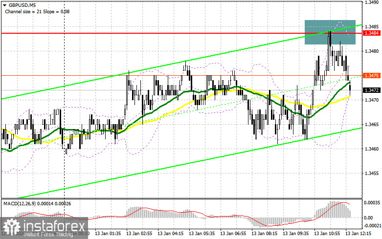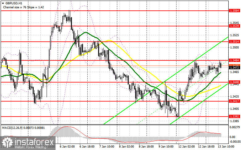 Продавцы проявили себя, но добиться более глубокой коррекции не удалось. Дальше все будет зависеть от того, какой будет американская инфляция. Ее снижение приведет к росту GBP/USD. В таком случае лишь уверенная защита ближайшего сопротивления 1.3484 с ложным пробоем на нем по аналогии с тем, что я разбирал выше, станет подтверждением правильной точки входа на продажу с целью снижения в район поддержки 1.3448, где проходят средние скользящие, играющие на стороне быков. Прорыв и обратный тест снизу вверх этого диапазона приведут к сносу стоп-приказов, открыв путь к 1.3417. Там ожидаю более активного проявления крупных покупателей. Самой дальней целью выступит область 1.3392, где собираюсь фиксировать прибыль. Если спрос на фунт вернется во второй половине дня, а медведи не проявят себя в районе 1.3484, быки получат шанс на более крупный рывок вверх. В таком случае продажи лучше всего отложить до теста сопротивления 1.3514. Открывать там короткие позиции буду только на ложном пробое. При отсутствии движения вниз и там, короткие позиции на отскок поищу в районе 1.3539, но лишь в расчете на коррекцию пары вниз на 30-35 пунктов внутри дня.