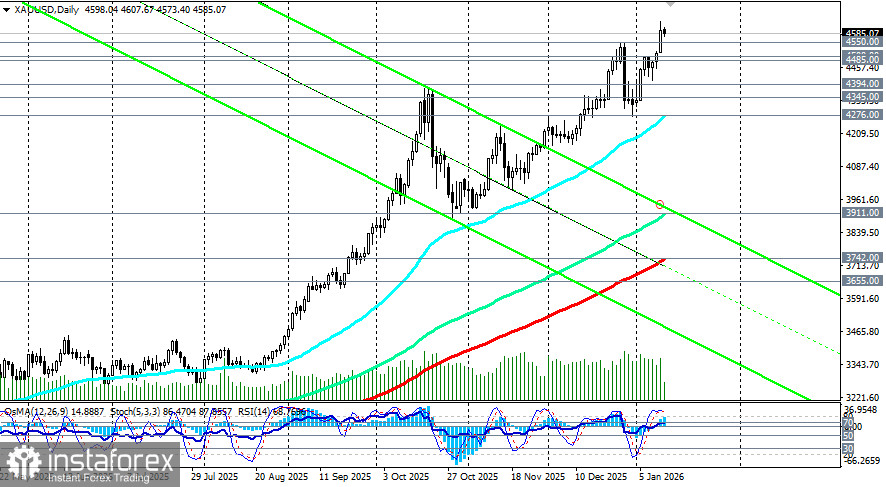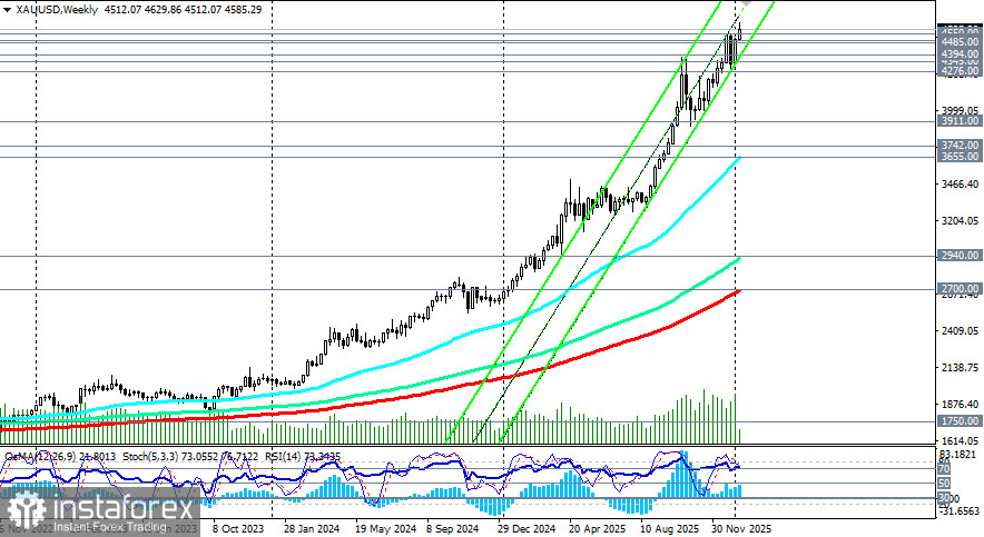 Актуальными в долгосрочном периоде остаются длинные позиции. Лишь пробой уровня поддержки 4276.00 и дальнейшее снижение могут всерьёз насторожить покупателей. В то же время, можно заметить, что, начиная, по крайней мере, с января 2025 года, 200-периодная скользящая на 4-часовом графике и 50-периодная скользящая средняя на дневном графике выступали мощными динамическими уровнями поддержки, ниже которых продавцам пробиться не удавалось.