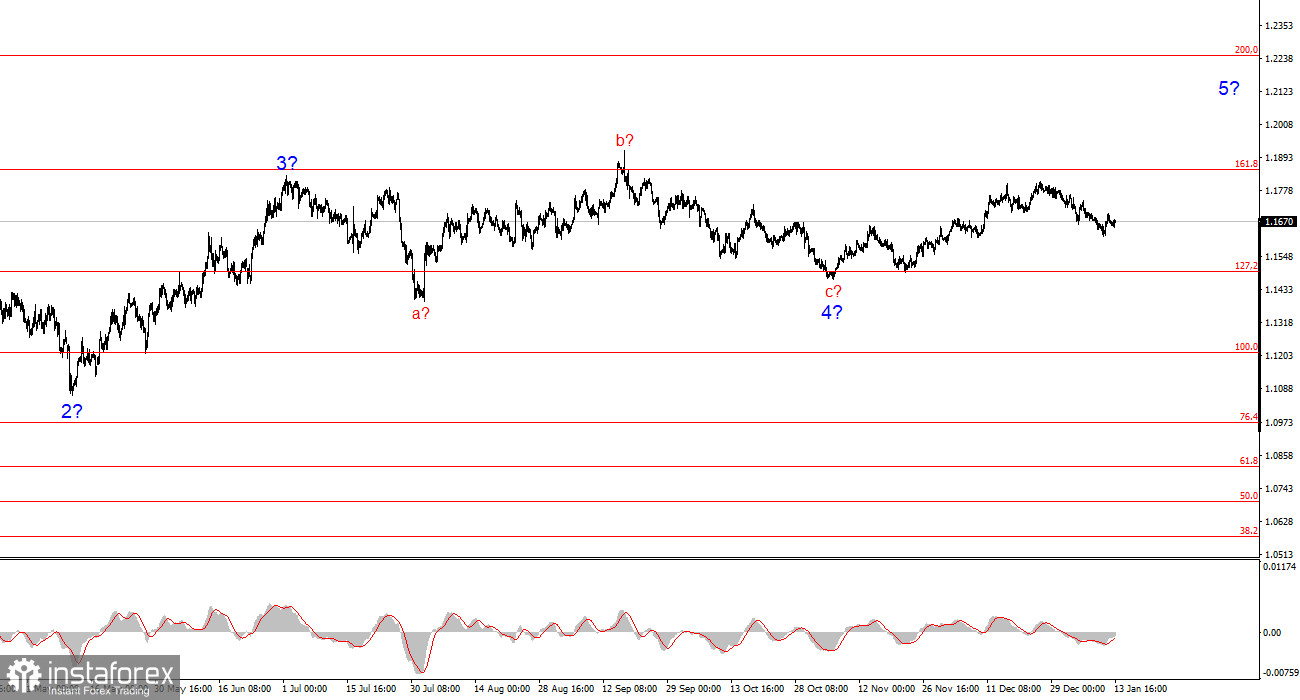 Волновая разметка 4-часового графика для инструмента EUR/USD имеет вполне понятный, хоть и довольно сложный вид в последние месяцы(нижняя картинка). Об отмене повышательного участка тренда, который берет свое начало в январе прошлого года, речи не идет, но волновая структура, начиная с 1 июля 2025 года, приняла протяженный вид. На мой взгляд, инструмент завершил построение коррекционной волны 4, которая имеет нестандартную внутреннюю разметку. Внутри этой волны мы наблюдали исключительно коррекционные структуры, поэтому сомнений в коррекционном характере этой волны не возникает никаких.