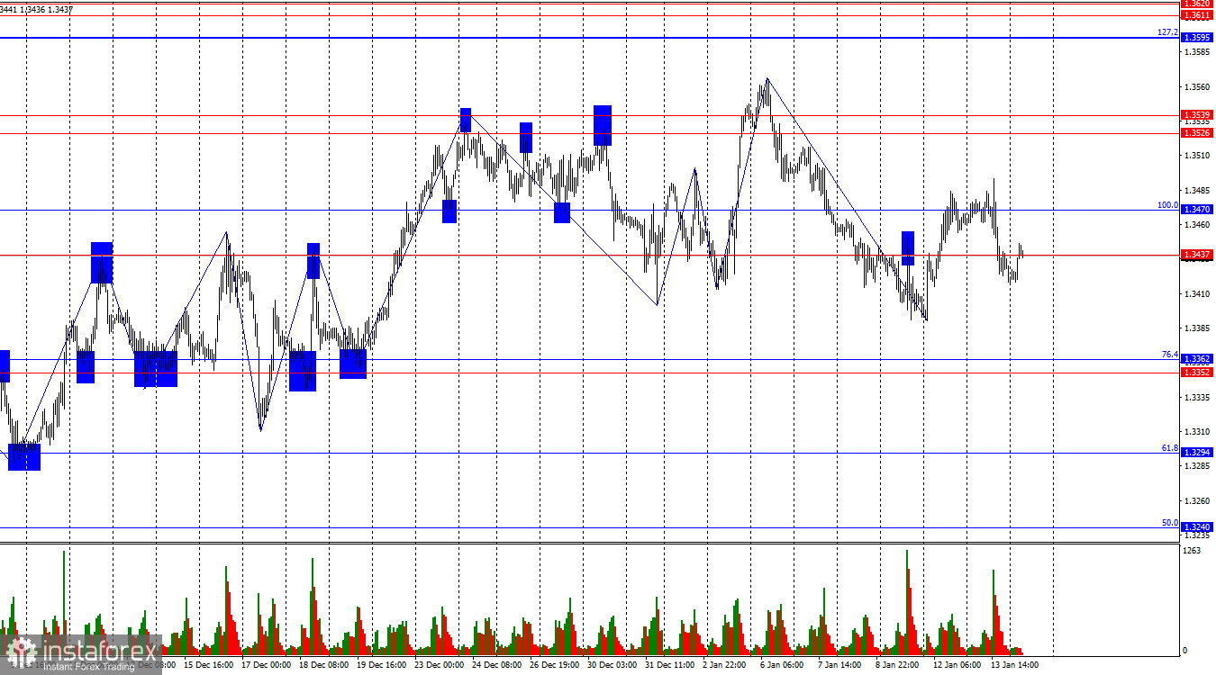 Сетки уровней Фибоначчи построены по 1,3470–1,3010 на часовом графике и по 1,3431–1,2104 на 4-часовом.