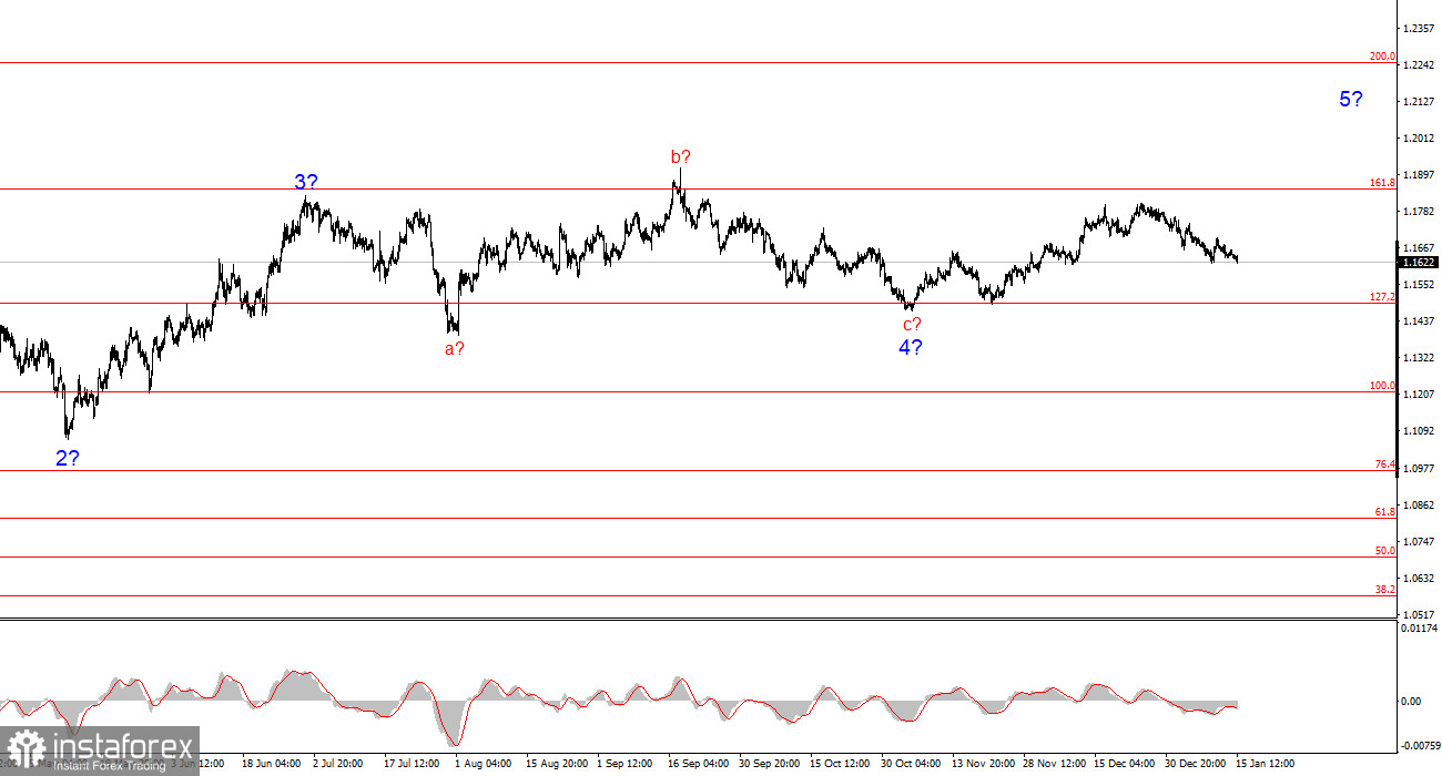 Волновая разметка 4-часового графика для инструмента EUR/USD остается без изменений. Об отмене повышательного участка тренда, который берет свое начало в январе прошлого года, речи не идет, но волновая структура, начиная с 1 июля 2025 года, приняла протяженный, коррекционный вид. На мой взгляд, инструмент завершил построение коррекционной волны 4, которая имеет нестандартную внутреннюю разметку. Внутри этой волны мы наблюдали исключительно коррекционные структуры, поэтому сомнений в коррекционном характере этой волны не возникает никаких.
