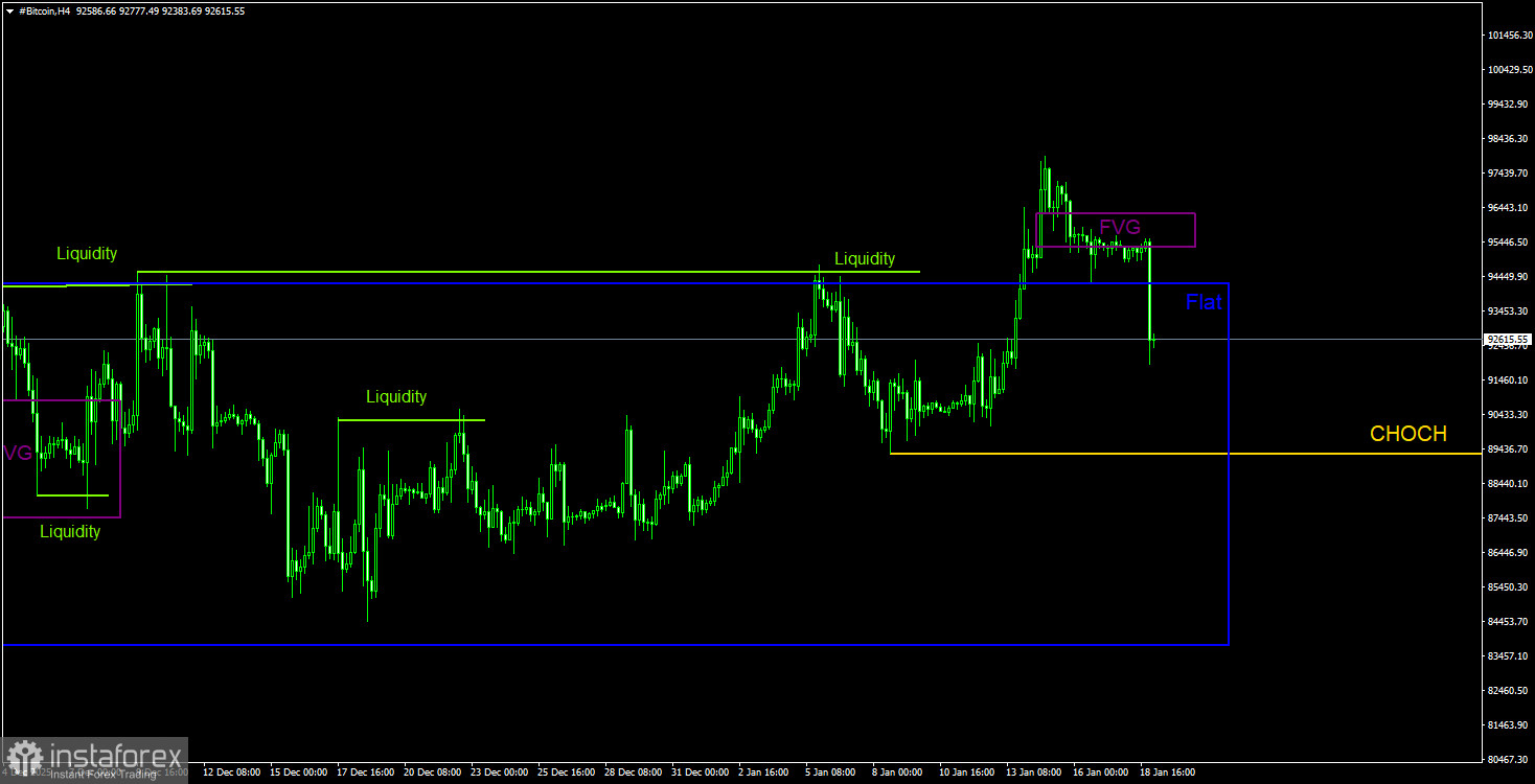 Ну что ж, биткоин продолжает падение после того, как был сформирован сигнал на продажу на дневном ТФ, которого мы ждали примерно месяц. Напомним, что в ходе последнего обвала биткоина был сформирован только один «медвежий» FVG, от которого в дальнейшем можно было ожидать реакции цены и возобновления нисходящего тренда. Также этот FVG выступал и выступает единственной областью POI для продаж на дневном графике. 15 января биткоин в рамках коррекции отработал этот паттерн и с тех пор опустился уже на 3,5-4 тысячи долларов. Таким образом, сейчас трейдеры могут лишь поддерживать уже открытые короткие позиции.