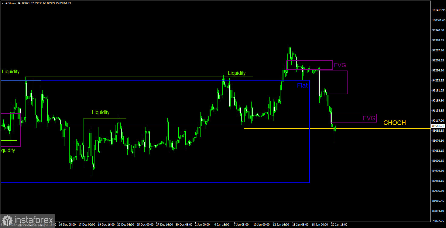 На дневном ТФ биткоин продолжает формирование нисходящей тенденции, продолжается коррекция. Структура тренда идентифицируется, как нисходящая, а линия CHOCH в данное время проходит на уровне 107 300$. Только выше этого уровня можно будет считать, что нисходящий тренд завершен. В 2026 году биткоин может падать хоть до 60 000$, откуда начинал свое последнее восхождение. Единственной областью POI для продаж выступал «медвежий» FVG, реакция на который уже была получена. Торговый сигнал сформирован, подтверждение получено. Целью нового витка нисходящего движения может выступать уровень 70 800% – 50,0% по Фибоначчи. «Бычий» FVG отменен, как и предполагалось.