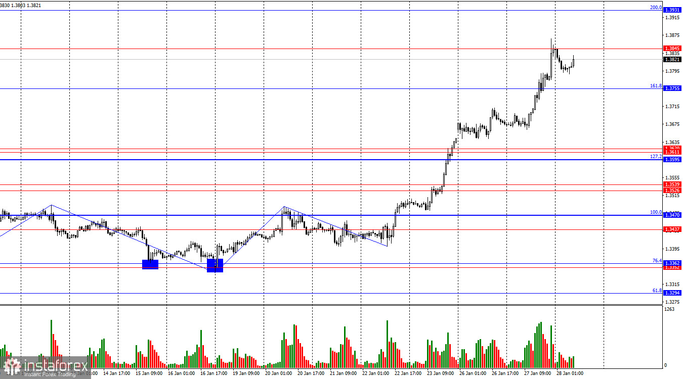 На часовом графике пара GBP/USD во вторник продолжала процесс роста и к концу дня оказалась около уровня 1,3845. Отбой пары от этого уровня сработал в пользу доллара США и некоторого падения в направлении уровня Фибо 161,8% – 1,3755. Отбой котировок от уровня 1,3755 позволит трейдерам ожидать возобновление роста британца в направлении уровней 1,3845 и 1,3931. Закрепление котировок под уровнем 1,3755 повысит шансы на падение в направлении зоны поддержки 1,3611–1,3620.