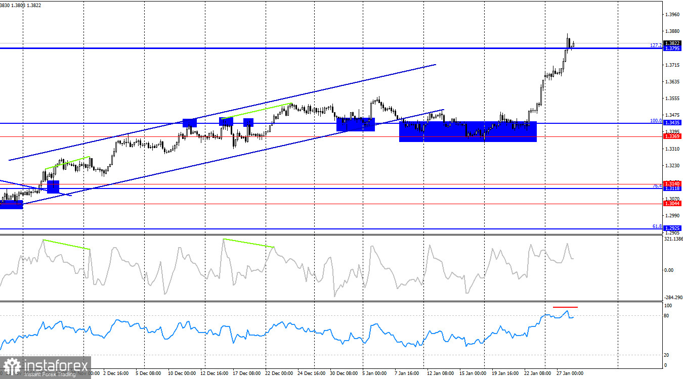 На 4-часовом графике пара выполнила рост к уровню Фибо 127,2% – 1,3795. Отбой котировок от уровня 1,3795 позволит трейдерам рассчитывать на разворот в пользу валюты США и некоторое падение. Не думаю, что сильное. Закрепление курса пары над уровнем 1,3795 повысит вероятность продолжения роста в направлении следующего уровня 1,4020. Назревающих дивергенций сегодня не наблюдается, но индикатор RSI перекуплен, что может вызвать коррекционный откат.