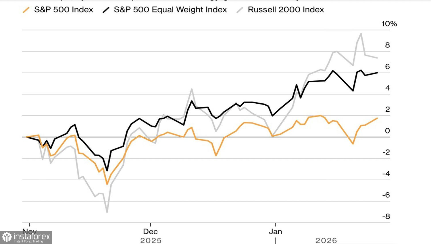 Около сотни эмитентов будут отчитываться за четвертый квартал на последней неделе января, включая Microsoft, Meta Platforms, Tesla и Apple. Эксперты Уолл-стрит ожидают от Великолепной семерки роста прибыли на 20% в октябре-декабре, что станет самой медленной динамикой показателя с 2023. Тем не менее цифра очень высока, что питает ралли акций технологических гигантов. Если в начале года S&P 500 без вариантов уступал индексу компаний малой капитализации Russell 2000, то на исходе второго месяца зимы подтягивается к лидеру.