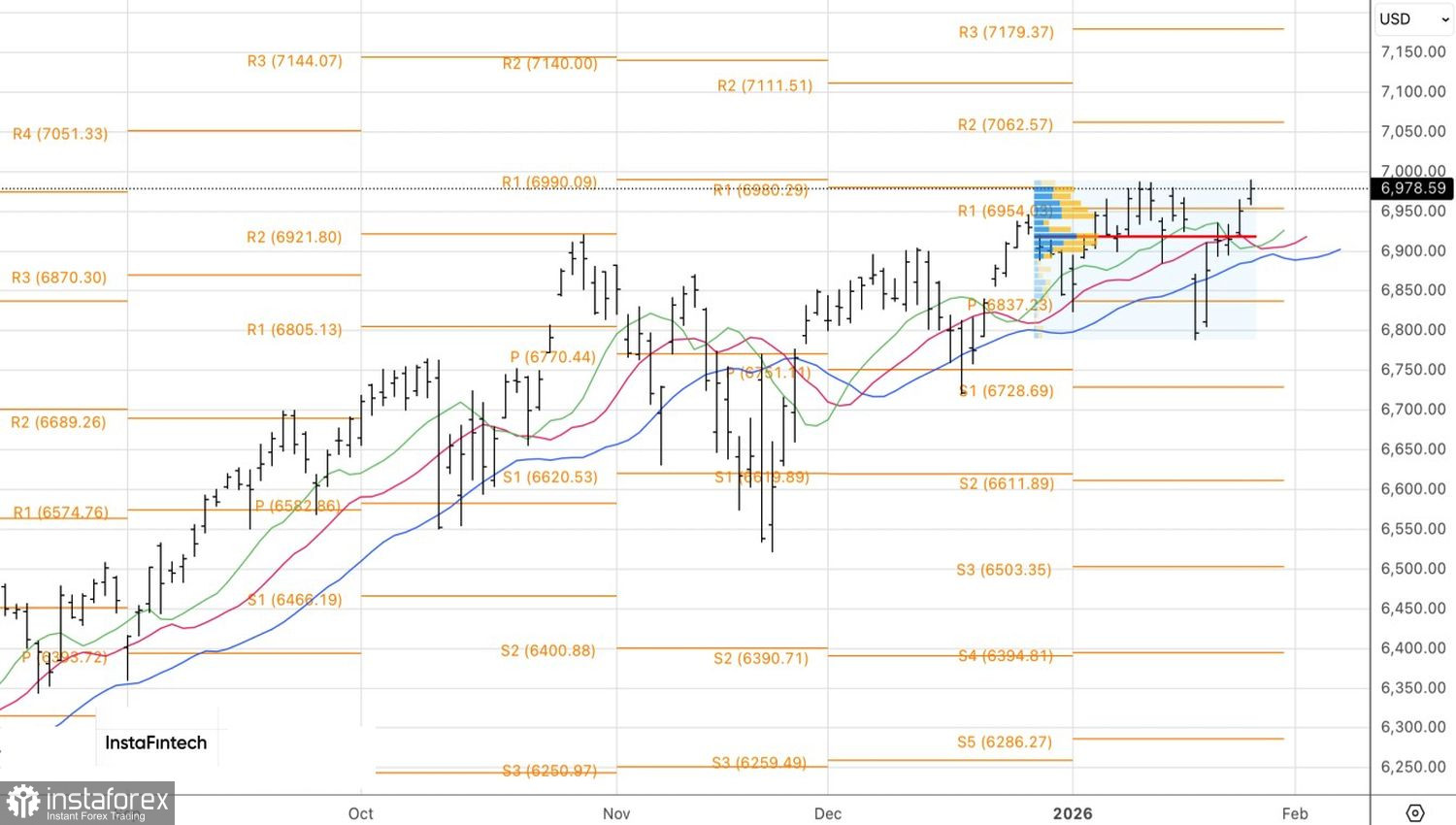 Технически на дневном графике S&P 500 имеет место восстановление восходящего тренда. Сформированные от 6935 и наращенные от 6985 лонги можно еще больше увеличить при помощи покупок максимумов на 6990. До психологически важной отметки 7000 рукой подать. Велика вероятность, что она будет достигнута в ближайшее время.