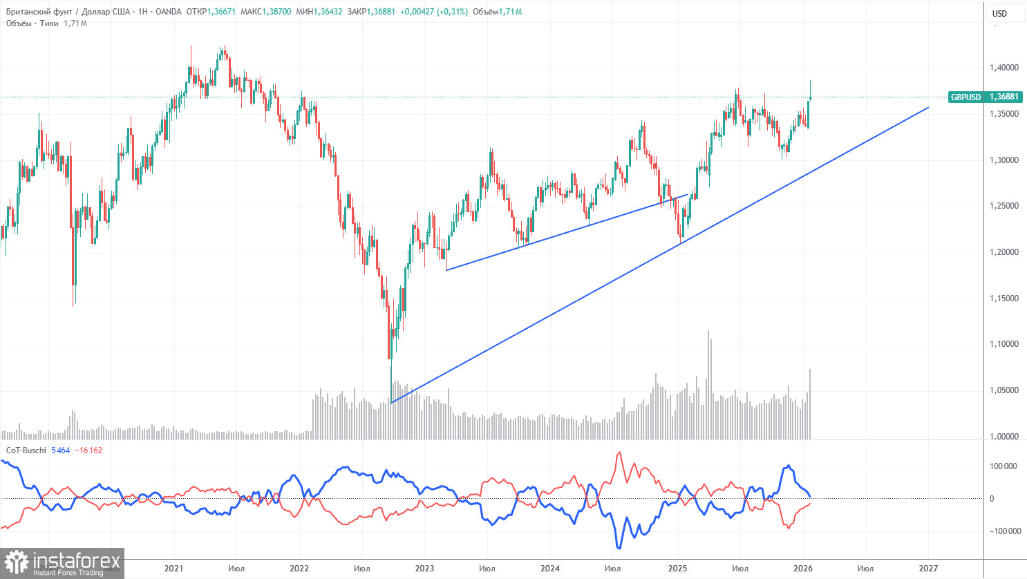Доллар продолжает снижаться из-за политики Дональда Трампа, что отлично видно на недельном ТФ(иллюстрация выше). Торговая война будет продолжаться в том или ином виде еще долгое время, а ФРС в любом случае будет снижать ставку в ближайшие 12 месяцев. Спрос на доллар так или иначе будет падать. Согласно последнему отчету COT(от 27 января) по британскому фунту, группа «Non-commercial» открыла 6,5 тысячи контрактов BUY и 0,6 тысячи контрактов SELL. Таким образом, нетто-позиция некоммерческих трейдеров увеличилась за неделю на 5,9 тысячи контрактов.