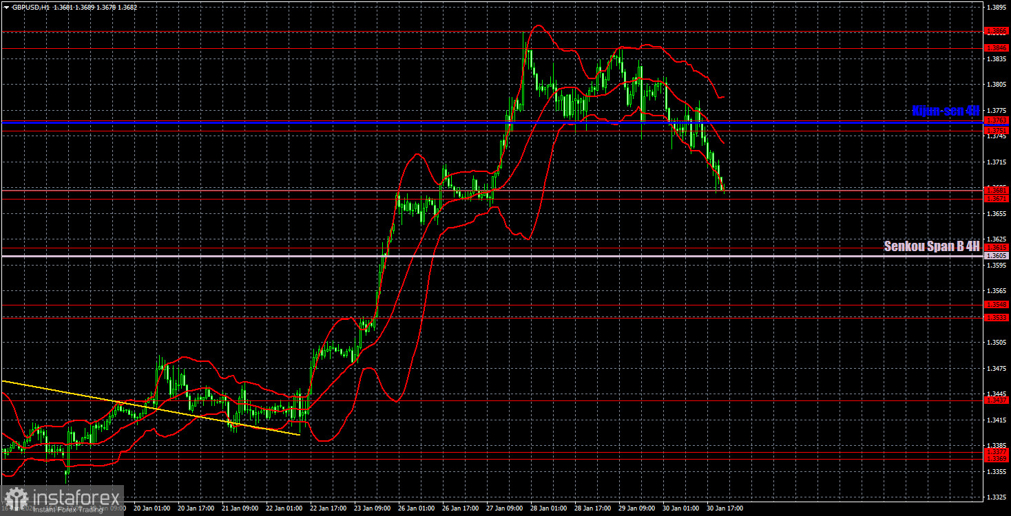 На 2 февраля мы выделяем следующие важные уровни: 1,3201-1,3212, 1,3307, 1,3369-1,3377, 1,3437, 1,3533-1,3548, 1,3615, 1,3671-1,3681, 1,3751-1,3763, 1,3846-1,3886, 1,3948. Линии Сенкоу Спан Б (1,3605) и Киджун-сен (1,3760) также могут быть источниками сигналов. Уровень Stop Loss рекомендуется выставлять в безубыток при прохождении цены в верном направлении 20 пунктов. Линии индикатора Ишимоку в течение дня могут перемещаться, что следует учитывать при определении торговых сигналов.