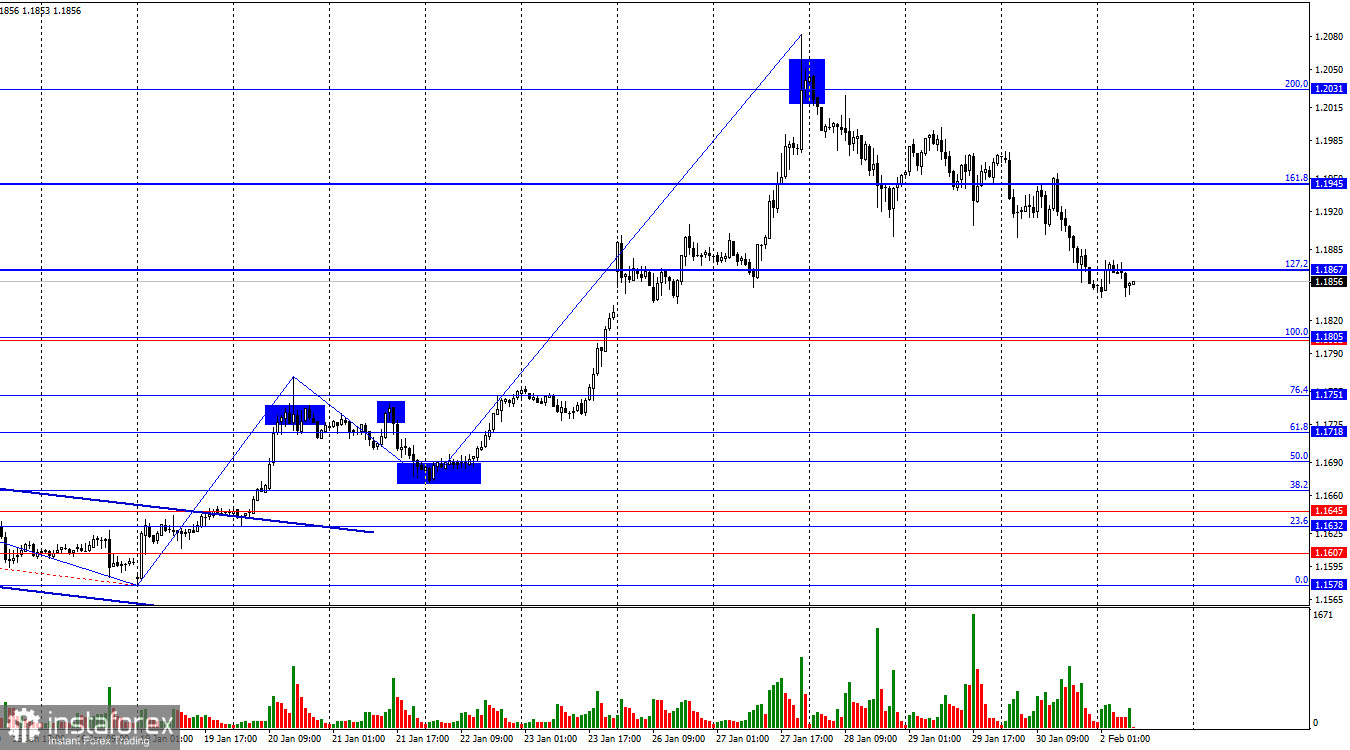 Ситуация с волнами на часовом графике остается простой. Последняя завершенная волна вниз не пробила лоу предыдущей волны, а последняя волна вверх пробила предыдущий пик. Таким образом, тренд остается «бычьим». Быки продолжают новое наступление, которого без Дональда Трампа могло бы и не случится. Трамп накалил обстановку в мире и в США до предела, а рынки продолжают реагировать бегством от опасной американской валюты с неопределенными экономическими перспективами.