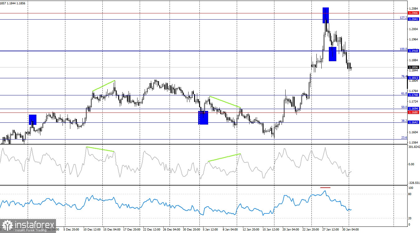 Сетки уровней Фибоначчи построены по 1,1805–1,1578 на часовом графике и по 1,1918–1,1471 на 4-часовом.