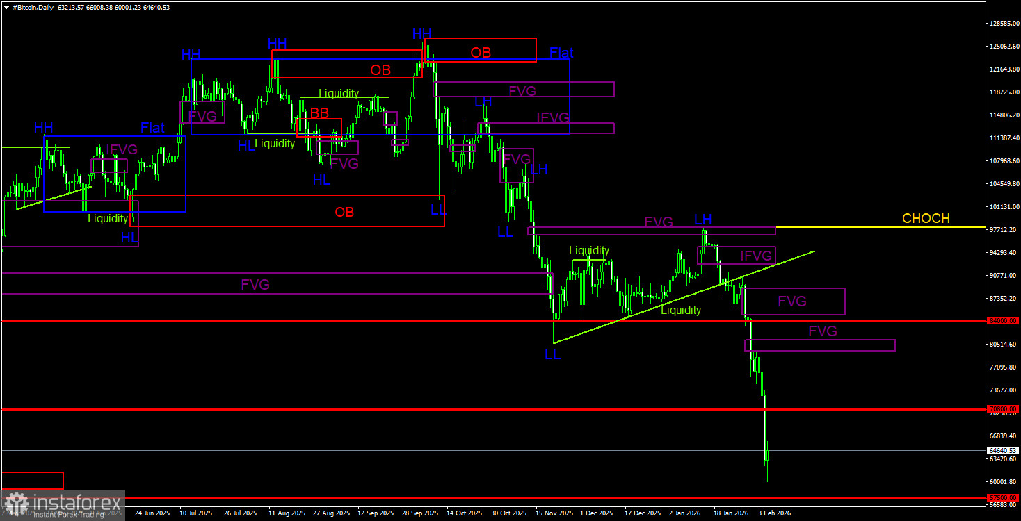 На дневном ТФ биткоин продолжает формирование нисходящей тенденции. Структура тренда идентифицируется, как нисходящая, а линия CHOCH в данное время проходит на уровне 97 900$. Только выше этого уровня можно будет считать, что нисходящий тренд завершен. «В 2026 году биткоин может падать хоть до 60 000$». Так мы говорили ранее. А теперь биткоину до уровня 60 000$ остается всего ничего. Только за вчерашний день BTC стал дешевле на 10 000$. Цена получила красноречивую реакцию на «медвежий» FVG(96 900$ – 98 000$), торговый сигнал был сформирован. С тех пор «биток» потерял уже 30 000$. Следующей целью падения выступает уровень 57 500$ – 61,8% по Фибоначчи. Областей POI сейчас целых три, а в ближайшее время могут сформироваться новые. Но какой в них смысл, если биткоин не корректируется?