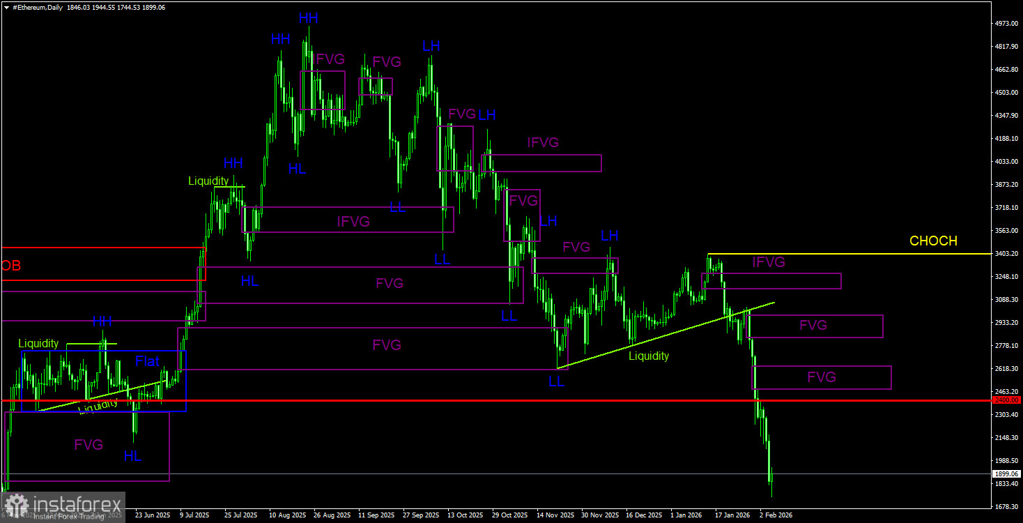 На дневном ТФ по эфиру также продолжается обвал. Мы продолжает наблюдать отработку «медвежьего» Order-block на недельном ТФ. Мы много раз говорили, что движение вниз может быть сильным и длительным. Так и происходит. На дневном ТФ по эфиру имеется три «медвежьих» FVG, на 4-часовом ТФ – три «медвежьих» FVG. От этих паттернов трейдеры могут рассматривать возможности открытия новых коротких позиций в будущем. Цели падения эфира находятся вплоть до уровня 1 370$, где начался последний восходящий тренд. В данное время эфир стоит уже 1900$... Осенью прошлого года его стоимость составляла почти 5 000$.