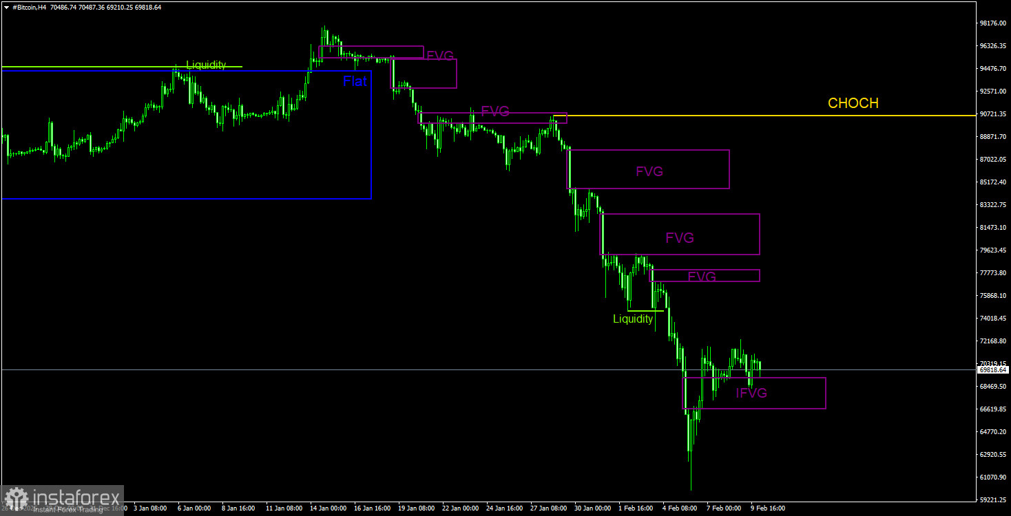 На дневном ТФ биткоин продолжает формирование нисходящей тенденции. Структура тренда идентифицируется, как нисходящая, а линия CHOCH в данное время проходит на уровне 97 900$. Только выше этого уровня можно будет считать, что нисходящий тренд завершен. «В 2026 году биткоин может падать хоть до 60 000$». Так мы говорили еще буквально неделю назад. Биткоин достиг уровень 60 000$ за несколько дней... Напомним, что сигнал на продажу был сформирован внутри «медвежьего» FVG(96 900$ – 98 000$) и получил подтверждение. Таким образом, трейдеры могли забрать практически все последнее движение. Текущей целью остается уровень 57 500$ – 61,8% по Фибоначчи. На дневном ТФ ближайшая область POI на продажу находится в диапазоне 79 500$ – 81 100$.