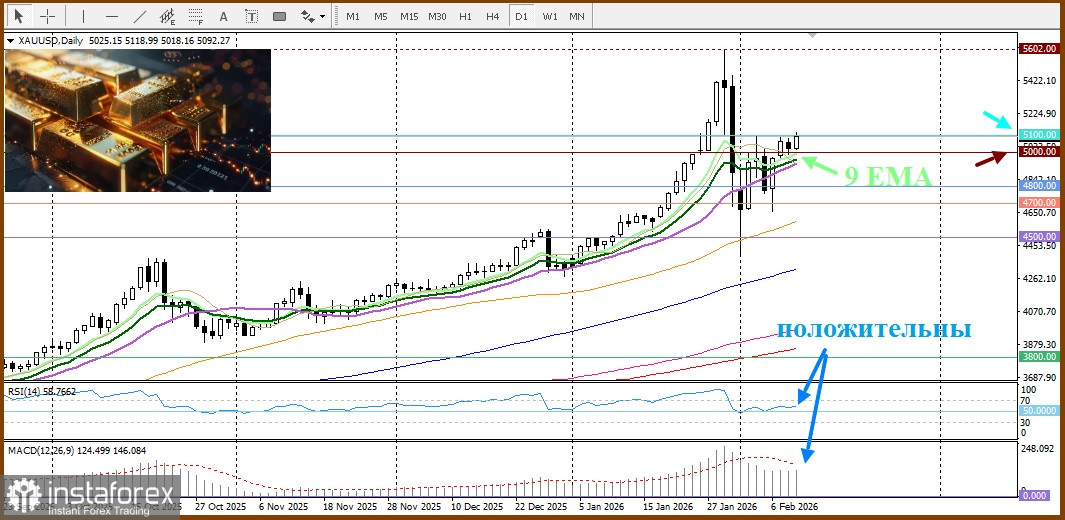 Тем не менее быки по золоту воздерживаются от агрессивных действий, так как число рабочих мест в несельскохозяйственном секторе (NFP) выросло на 130 тыс., превысив рыночный консенсус (около 70 тыс.) и скорректированный декабрьский показатель (48 тыс.). Уровень безработицы опустился до 4,3% с 4,4%. Средняя почасовая заработная плата ускорилась на 0,4% в январе против 0,1% в декабре, обогнав ожидания в 0,3%; в годовом исчислении она осталась на 3,7%, слегка выше прогноза в 3,6%. Эта динамика зарплат подчеркивает инфляционное давление. Но такие индикаторы уменьшают срочность смягчения денежно-кредитной политики Федеральной резервной системой. Поэтому быки по золоту замерли в неопределённости. При этом базовый бычий фон в сочетании с признаками снижения геополитической напряженности на Ближнем Востоке тоже сдерживает ралли защитного актива. Следовательно, стоит ожидать подтверждения покупательского давления перед входом в длинные позиции.