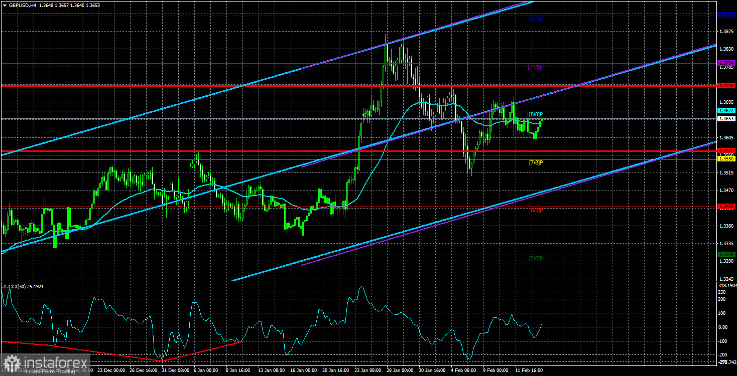 Валютная пара GBP/USD в течение пятницы также не показала никаких интересных движений, несмотря на то, что в этот день был опубликован резонансный отчет по инфляции в США. В чем заключается его резонансность? Фактически значение отчета за январь совпало с прогнозами. Индекс потребительских цен замедлился до 2,4% г/г, и некоторые(не все) прогнозы указывали на это значение. В то же время обыденным его назвать нельзя. Во-первых, большинство прогнозов все же свидетельствовало о замедлении инфляции только до 2,5%. Во-вторых, сам по себе факт замедления на 0,3% в годовом выражении за один месяц – это достаточно неожиданная новость. В-третьих, инфляция в США снижается уже четвертый месяц подряд, что само по себе знаменательное событие. В-четвертых, снижение инфляции в область 2% значительно повышает вероятность усиления «голубиных» планов ФРС на 2026 год. Ведь, по сути, ФРС уже не нужно удерживать ставку на столь «ограничительном» уровне, как сейчас – рынок труда по итогам январе продемонстрировал признаки восстановления, а инфляция движется к целевому уровню.