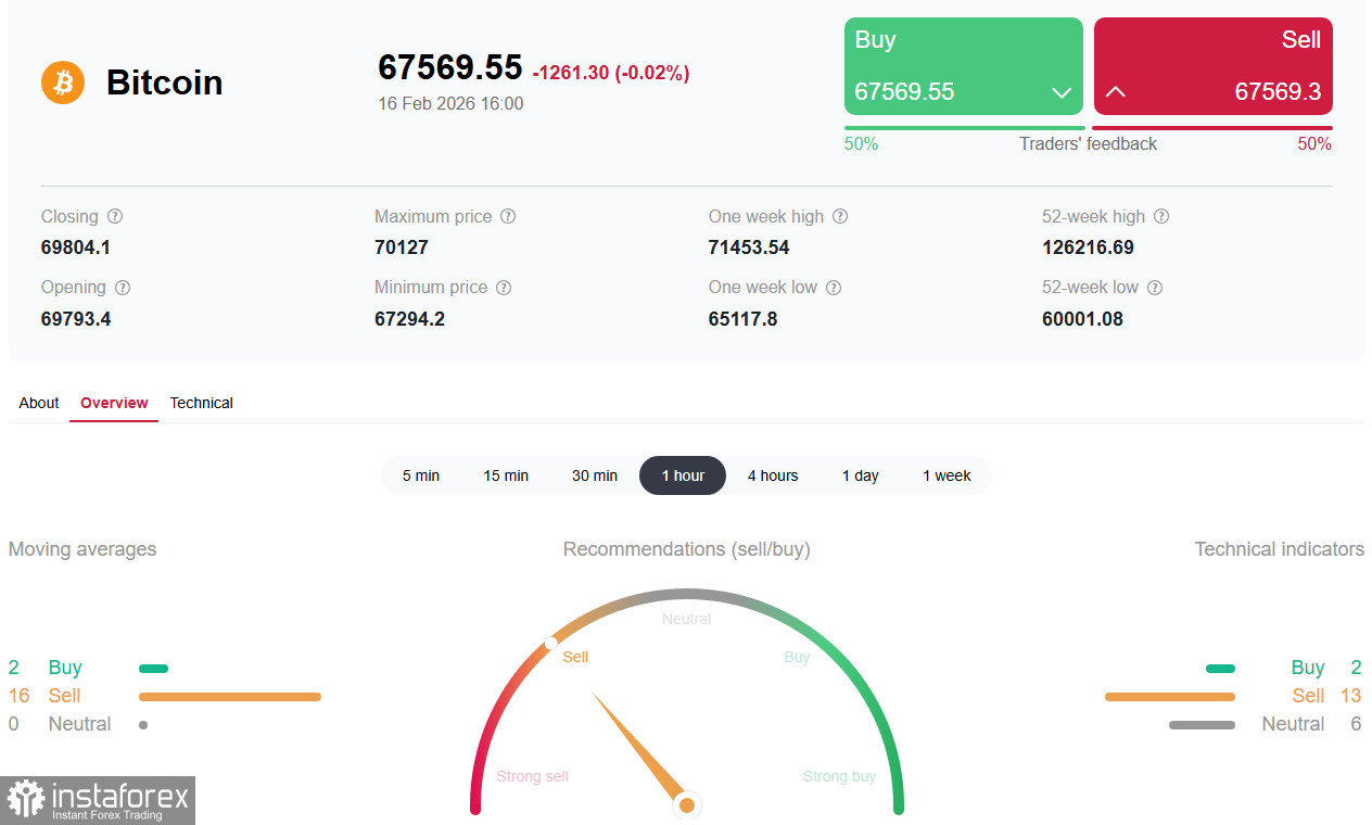 Негативный сценарий (углубление коррекции). Если биткоин не сможет удержаться выше 70000.00, а регуляторное и макроэкономическое давление сохранится, возможна просадка в диапазон 60000–50000.00. По разным оценкам, текущая цена уже опустилась ниже расчетной себестоимости добычи биткоина (около 87000.00), что исторически является «мягкой нижней границей». Длительное закрепление ниже этого уровня может вынудить убыточных майнеров покидать рынок.