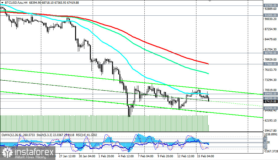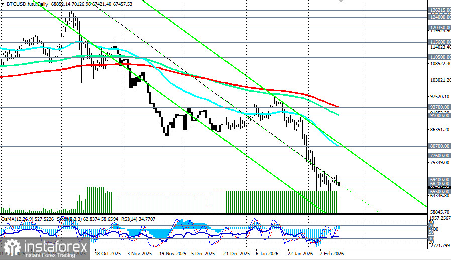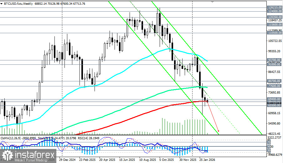 Ситуация остается неопределенной, с признаками как возможной консолидации, так и углубления падения. BTC/USD консолидируется в узком канале 65000.00–72000.00. Ключевая поддержка находится в зоне 68000.00–68200.00 (ЕМА200 на недельном графике). Если она не устоит, следующей целью станет зона 65000.00–67000.00, а затем и 60000.00, которую можно рассматривать как важный психологический рубеж. Сопротивление остается на 70000.00–71500.00, и только уверенный пробой выше 72000.00 может открыть дорогу к 76000.00 (ЕМА144 на недельном графике) – 80000.00.