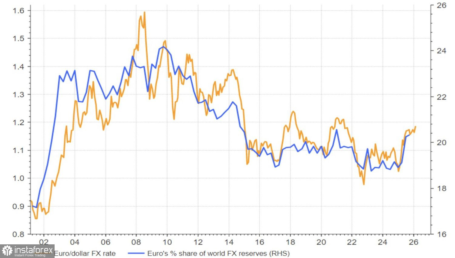 Bank of America вспоминает недавнюю историю рекомендаций Пекина китайским банкам избегать покупок трежерис. Она спровоцировала масштабные распродажи доллара США. Однако банк отмечает, что процесс ухода Поднебесной от американских активов идет уже давно. В нем нет ничего экстраординарного, чтобы так реагировать. Другое дело, европейские инвесторы. Они сидят на иголках из-за необходимости делать ротацию портфелей. Ускорение этого процесса подставит плечо EUR/USD. Как и увеличение роли евро в мировой экономике.