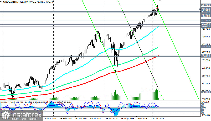 С технической точки зрения, фьючерсы на индекс Доу-Джонса (или DJIA – INDU в торговом терминале) остаются в восходящем тренде, хотя импульс замедляется. Индикаторы (RSI, OsMA, Стохастик) на дневном графике развернулись в медвежью сторону. Ключевой поддержкой выступает зона 49000.0–48890.0 (ЕМА50 и нижняя линия восходящего канала на дневном графике), пробой которой может открыть дорогу к более глубокой коррекции. Ближайшее сопротивление находится в районе 49630.0 (ЕМА200 на 1-часовом графике) – 497500.0 (локальные максимумы).